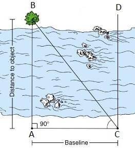 Kuzatuvchiga nisbatan uzoq, ya’ni u borib bo‘lmaydigan nuqtalargacha masofani aniqlash geometriya kursidan bizga ma’lum. 2.3-rasmda A nuqtadan turib, daryoning narigi qirg‘og‘ida joylashgan B daraxtgacha masofani topish kerak bo‘lsin.