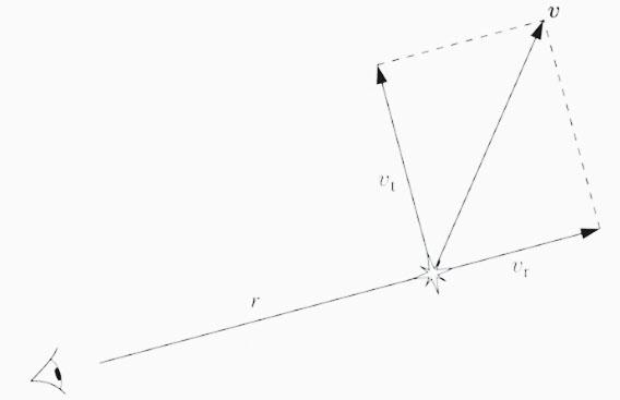 Yulduzning tezligini Quyoshga nisbatan ikkita tashkil etuvchiga ajratishimiz mumkin (2.16-rasm), shundan ulardan bittasi kuzatish o'qi bo'yicha yo'nalgan (radial komponenta yoki radial tezlik) va ikkinchisi unga perpendikulyar bo'ladi (tangentsial komponenta). Tangentsal tezlik hususiy harakatga ta'sir etadi, u esa o'z navbatida bir necha yillar va hattoki o'nyilliklar