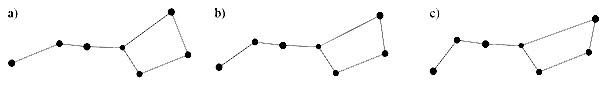 2.15-rasm. Yulduzlarning xususiy harakatlari yulduz turkumlarning shakllarini o'zgartiradi. Katta Ayiqning shakllari: (a) 30,000 yil avval; (b) hozirgi davrda; (c) 30000 yildan so'ng |
