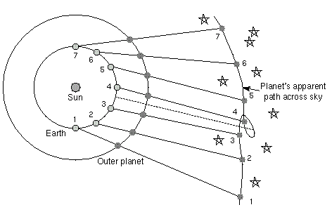 Quyida 3.1-rasmda Yer va tashqi sayyora (misol uchun Saturn) ning Quyosh atrofida aylanishlarida Yer va sayyoraning mos paytlardagi orbital holatlari keltirilgan. Chizmaning tepa qismida Erdan qaralganda, osmonda sayyoraning qo‘zg‘almas yulduzlar fonidagi to‘g‘ri va qaytma harakatlari aks ettirilgan. Bunda sirtmoq Yer va sayyora orbitalari ustma-ust tushmasdan, o‘zaro burchak hosil kilganligi tufayli “ochilib” ko‘rinadi. Ba’zan sayyoraning harakati to‘g‘ri (g‘arbdan-sharqqa) bo‘lib, ba’zan u teskari harakatlanganligini kuzatish mumkin. So‘ngra sayyora yana to‘g‘ri harakatini davom ettirishi ham chizmada yaxshi ko‘rinadi. Sayyora teskari harakatlangandek ko‘rinishiga diqqat bilan qaralsa, u sayyorani Yer quvib o‘tayotgan davriga to‘g‘ri kelishini topish qiyin emas. Binobarin tashqi sayyoralar ko‘rinma harakatida orqaga qaytish faqat Yer ularni quvib o‘tayotganda sodir bo‘lar ekan.