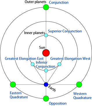 Ichki sayyoralar hech qachon qarama-qarshi konfigurasiyada bo’lmaydi. Agar Sayyora Yer hamda Quyoshning o’rtasida joylashsa bunday konfigurasiyaga quyi qo’shilish deyiladi. Yer, Quyosh va Sayyora ketma-ketligida bir chiziqda joylashsa, bu yuqori qo’shilish deb ataladi. Yerdan kuzatilganda sayyoraning Quyoshdan eng katta burchak masofasiga elongatsiya deyiladi.
