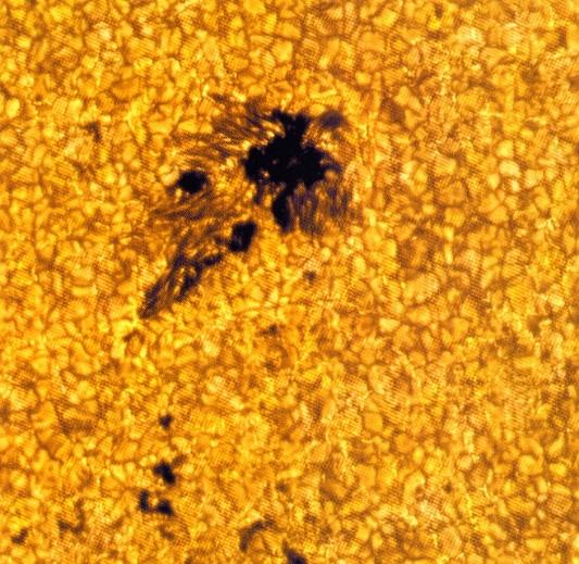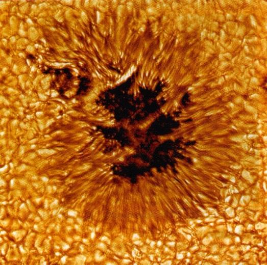 Granulalar orasida kichik nuqta shaklida Quyosh dog‘lari paydo bo‘ladi. Dog‘ning bunday paydo bo‘lishi pora deb yuritiladi. Poralar - asosan mash’alli sohada joylashgan granulalar orasida vujudga keladi. Quyosh dog‘i ikki qismdan iborat bo‘lib, uning markaziy timqora qismi yadro yoki soya deyiladi. Yadroni o‘rovchi qismi esa yarim soya deb yuritiladi (5.5-rasm). Dog‘larda juda kuchli magnit maydoni mavjud bo‘lib, maydon kuchlanganligi ayrim dog‘larda 4000-4500 erstedgacha etadi.