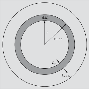 Energiya ajralishi. Muvozanatning uchinchi sharti energiya saqlanishini talab etadi, bundan, yulduzda ajralgan ixtiyoriy energiya uning sirtigacha etishi va nurlantirilishi lozim. Yana, r radius ichida dMr joylashgan va qalinligi dr bo‘lgan sferik qobiqni olib ko‘raylik (6.7 rasm). Energiya oqimi Lr bo‘lsin, ya’ni, vaqt birligida r sirtidan o‘tayotgan energiya miqdori bo‘lsin. Agar yulduzda vaqt va massa birliklarida ajralgan energiya miqdori, ya’ni, energiya ajralish koeffitsienti ε bo‘lsa, unda