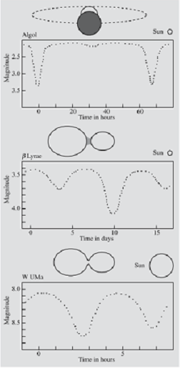 Tutuluvchan o‘zgaruvchan yulduzlarda yulduziy kattaliklari o‘zgarishi vaqt funksiyasi sifatida taqdim etilishi yorqinlik egri chizig‘i deb nomlanadi. Yorqinlikning egri chizig‘ining shakliga ko‘ra bunday yulduzlar uchta asosiy turga bo‘linadi, bular: Algol, Liraning β yulduzi va Katta Ayiqning W yulduzidir (9.6 rasm).