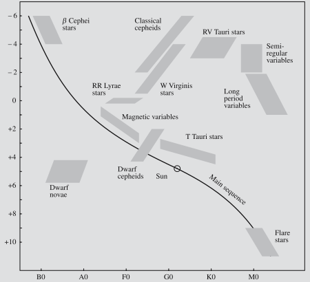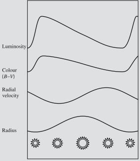 Cepheidlar. Pulsatsiyalanivchi o'zgaruvchanlarning orasida eng muhimlari cepheidlar bo'lib ular δ Cephei nomiga qo'yilgan. Ular F-K spektral klassning guruh I upergigantlari hisoblanadi (yulduzlar guruhlari 17.2 bo'limda tahlil qilingan). Ularning davri 1–50 kunlarni va ularning amplitudalari 0.1–2.5 miqdorlarni tashkil etadi. Yorug'lik grafigining shakli to'g'ri, tez yorqinlashish va undan keyin sekinroq pasayishni. Cepheidlarning davri va absolyut miqdori(ya'ni yorqinligi) o'rtasida aloqadorlik mavjud bo'lib, u 1912 yilda cepheidlardan Kichik Magellan Bulutida Henrietta Leavitt tomonidan kashf etilgan. Bu davr-yorqinlik bog'lanishdan (Rasm. 6.20) foydalanib yulduzlargacha va yaqinroqdagi galaktikalargacha bo'lgan masofani o'lchash mumkin.