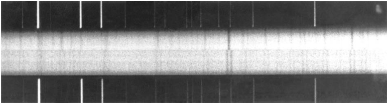 6.15 rasm. Spektral qo‘shaloq k Ari yulduzining spektri. Yuqoridagi spektrda spektral chiziqlar yakka-yakka, quyidagisida ikkilangan. (Lik observatoriyasi). |
