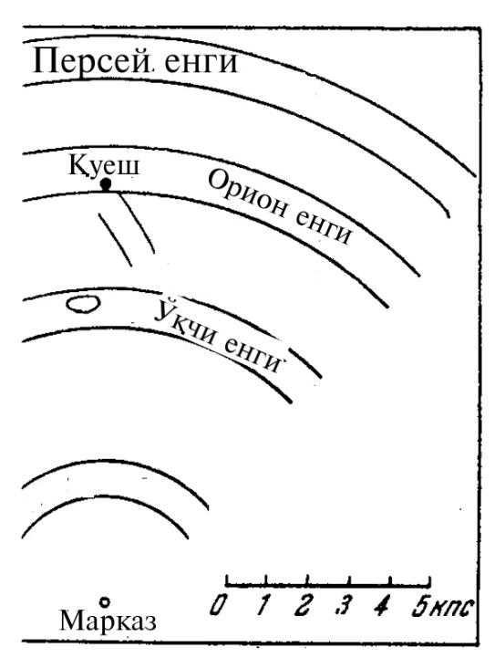 Masalan, Orion yulduz turkumida joylashgan yosh va turli qaynoq yulduzlar «Orion engi» deb ataluvchi tarmoqni hosil qilib, uning bir chetida Quyosh joylashadi. Bundan tashqari galaktikamizda yana ikki yirik tarmoqlar Qavs engi tarmog‘i (Galaktika markazi tomonda) va Persey tarmog‘i (Galaktika markazidan qarama-qarshi tomonda)ning mavjudligi aniqlandi (7.3 -rasm).