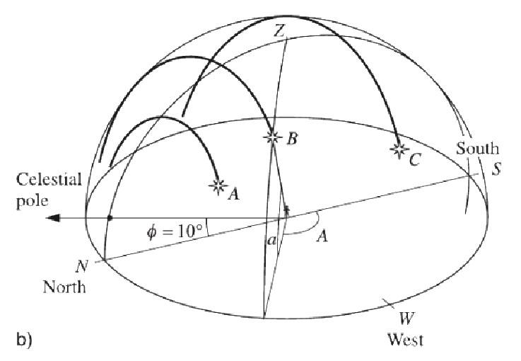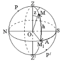 Berilgan ixtiyoriy M nuqtaning bu sistemadagi o`rnini belgilash uchun bu nuqtadan va Z dan o`tuvchi katta yarim aylana o`tkazib, uning sfera sirtida gorizont bilan kesishish nuqtasini M1 deb olaylik (1.6-rasm). Unda yoy SM1=SOM1=A deb belgilab, bu koordinatani M yoritgichning azimuti deyiladi. Azimut astronomiyada odatda S nuqtadan g`arb tomonga, ya`ni osmon sferasining sutkalik ko`rinma aylanishi tomoniga qarab o`lchanib, 0A 360. Ayrim mamlakatlarda azimut ikki tomonga o`lchanib, g`arbiy azimut 0<A180° va sharqiy azimut –180°A<0° deb olinadi.