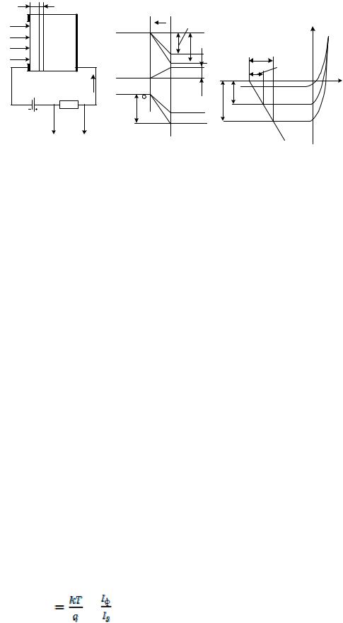 Рисунок 8.9 – Фотоприймач з р-n-переходом: а – діод, р-область якого опромінюється світлом; б – зонна діаграма р-n-переходу діода, що показує виникнення фотоерс; в – вольт-амперна характеристика освітленого р-n- переходу при різних потужностях світлового потоку