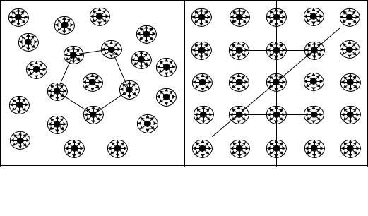 Рисунок 2.2 – Розташуваннячастинокврідинах(а) ітвердих кристалічнихтілах(б)