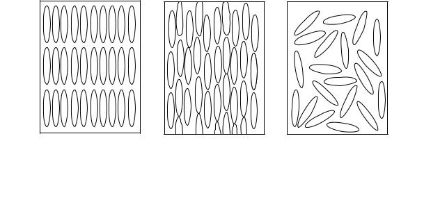Рисунок 2.4 – Схематичне зображення розташування молекул в кристалічній (а), рідкокристалічній (нематичній) (б) і рідкій (в) фазах