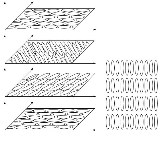 де R і R ' – короткі, частково гнучкі ланцюги; а зв'язок А – В – подвійний або потрійний. Такі «молекули-стрижні» завжди намагаються розташуватися уздовж одного напряму, тобто певною мірою впорядковано. У міру зростання температури ступінь впорядкованості зменшується і врешті-решт зникає повністю. Діапазон температур, в межах якого існує рідкокристалічна фаза, складає звичайно декілька десятків градусів. Відмінність у взаємному розташуванні молекул в кристалічній, рідкокристалічній і рідкій фазах показано на рис. 2.4. Як видно з цього рисунка, далекий порядок розташування, центрів молекул в рідкокристалічному стані відсутній, рідкі кристали текучі і утворюють краплі подібні звичайним рідинам. Є, проте, певний порядок у напрямі молекул, що приводить до анізотропії властивостей таких кристалів (оптичних, електричних, магнітних і ін.). Наприклад, різниця показників заломлення для світла, поляризованого паралельно і перпендикулярно орієнтації молекул, складає звичайно приблизно 0,2. Чудовою властивістю рідких кристалів, що зумовила їх широке застосування в сучасній електроніці для відображення інформації, є те, що завдяки низькій в'язкості рідких кристалічних тіл орієнтацію молекул в них можна змінювати порівняно невеликими електричними полями. Зміна ж орієнтації молекул приводить до зміни оптичних властивостей рідкого кристала. Як видно з рис. 2.4, б, молекули в кристалічній фазі орієнтовані уздовж одного напряму не строго, мають флуктуації в їх орієнтації. Це приводить до великої оптичної мікронеоднорідності середовища і сильному розсіюванню світла в ній.