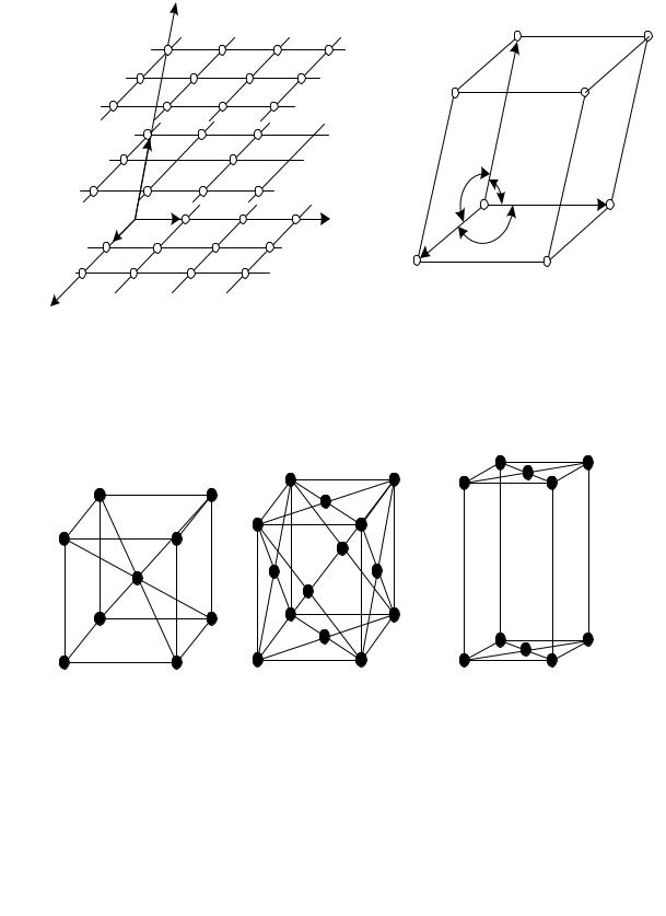 Прості гратки. З геометричної точки зору правильне розміщення частинок в кристалі, що періодично повторюється, можна описати за допомогою операції паралельного переміщення або трансляції. На рис, 2.6, а показані гратки, одержані трансляцією частинки 0 уздовж трьох осей: осі х на відрізки а, 2а, ..., осі у на відрізки b , 2b , .., осі Z на відрізки с, 2с, ...