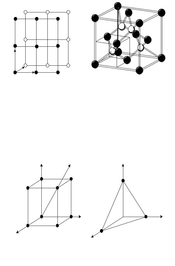 Як приклад тривимірних граток з базисом на рис. 2.8, б показані гратки алмазу. Базис таких граток містить два атоми з координатами 0, 0, 0 і 1/4, 1/4, 1/4. Кожний атом вуглецю оточений чотирма найближчими сусідами, розташованими у вершинах тетраедра, виділеного на рис. 2.8, б штриховими лініями.