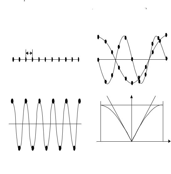 Як приклад на рис. 4.1, а показана одновимірна модель твердого тіла – лінійний ланцюжок атомів, віддалених на відстані а один від одного і здатних коливатися в одному напрямі перпендекулярно осі ланцюжка. Якщо кінці ланцюжка з’єднані так, що повинні виконуватися періодичні граничні умови, то коливання, що відповідає найнижчій частоті