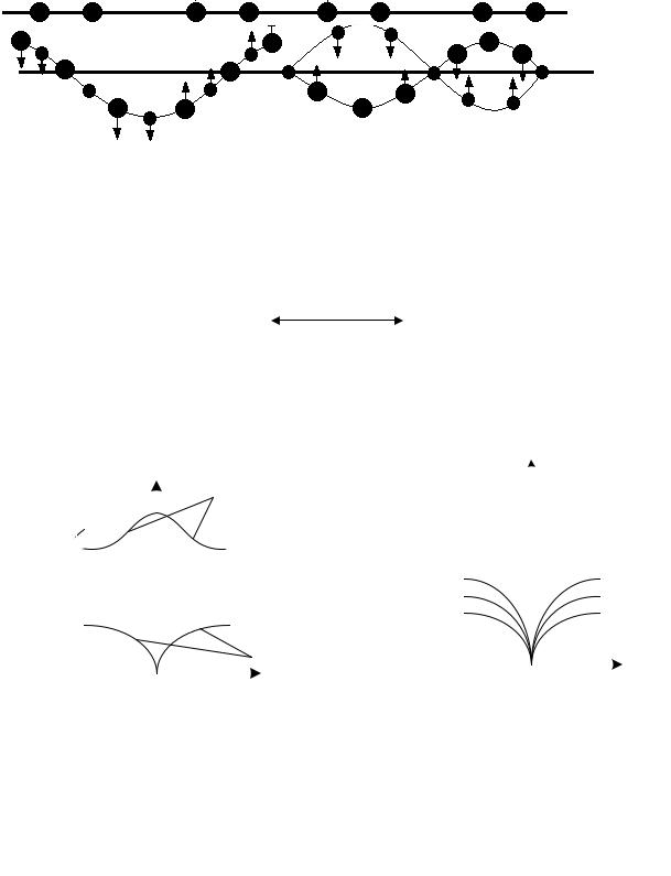 ланцюжка (рис. 4.1, б; крива 1). Наступному нормальному коливанню відповідає хвиля удвічі меншої довжини (крива 2) і т. д. Очевидно, що найкоротша довжина хвилі, яка може утворитися в такому ланцюжку, рівна подвоєній відстані між атомами ланцюжка (рис. 4.1, в):