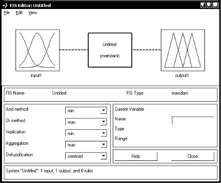 Завантаження FIS-редактора відбувається за допомогою командиfuzzy. У результаті з'являється інтерактивне графічне вікно. У нижній частині графічного вікнаFIS-редактори розташовані кнопки Help і Close, що дозволяють викликати вікно довідки і закрити редактор, відповідно.
