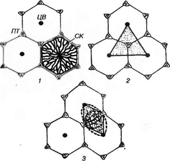 Рис. 5-21. Структурно-функциональные единицы печени: "классическая" долька (1), портальная долька (2), печеночный ацинус (3). ПТ - печеночная триада, СК - синусоидные капилляры, ЦВ - центральная вена. Пунктиром показаны зоны печеночного ацинуса. Объяснение в тексте.