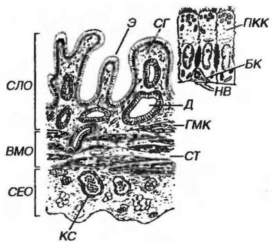Рис. 5-22. Стенка желчного пузыря. СЛО - слизистая оболочка: Э - эпителий, ПКК - призматические каемчатые клетки, БК - базальные клетки, НВ - нервное волокно, СП - собственная пластинка, Д – дивертикулы. ВМО - волокнистомышечная оболочка: ГМК - гладкомышечные клетки, СТ - соединительная ткань, CEO - серозная оболочка, КС - кровеносные сосуды.