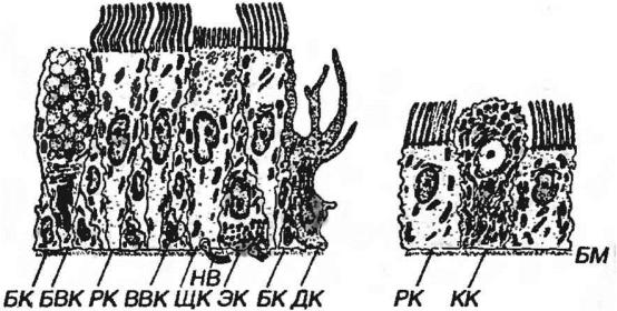 Рис 6-1. Клетки эпителия воздухоносных путей - бронхов (слева) и бронхиол (справа), РК - реснитчатая клетка, БВК - бокаловидная клетка, БК - базальная (низкая вставочная) клетка, ВВК - высокая вставочная клетка, ЩК - щеточная (безреснитчатая) клетка, ДК - дендритная клетка, КК - клетка Клара (бронхиолярный экзокриноцит), БМ - базальная мембрана, НВ - нервное волокно.