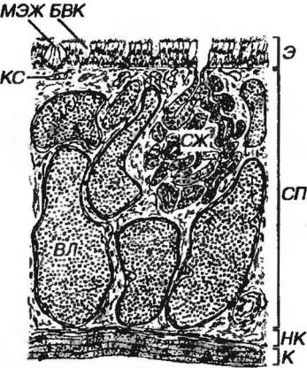 Рис. 6-2. Носовая полость: дыхательная область. Э - эпителий: БВК - бокаловидные клетки, МЭЖ - многоклеточная эндоэпителиальная железа. СП - собственная пластинка: СЖ - смешанная железа, КС - капиллярное сплетение, ВЛ - венозные лакуны, НК - надкостница, К - кость.