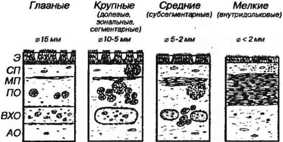 Рис. 6-5. Строение стенки бронхов различного калибра (схема). Э – эпителий, СП - собственная пластинка, МП - мышечная пластинка, ПО - подслизистая основа, ВХО - волокнисто-хрящевая оболочка, АО - адвентициальная оболочка. Объяснение в тексте. Различия абсолютной толщины стенки бронхов на схеме не отражены.