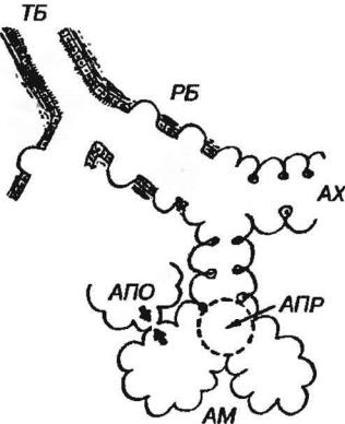 Рис. 6-6. Терминальная бронхиола и ацинус легкого (схема). ТБ - терминальная бронхиола, РБ - респираторная бронхиола, АХ - альвеолярный ход, АПР - альвеолярное преддверие, AM - альвеолярные мешочки, АПО - альвеолярные поры (Кона).