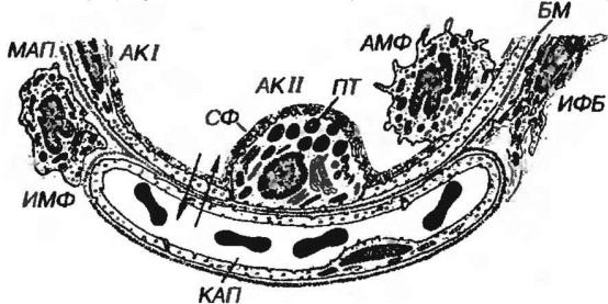 Рис. 6-7. Альвеола и межальвеолярная перегородка. АКI - альвеолярная клетка I типа, АКII - альвеолярная клетка II типа: ПТ - пластинчатое тельце, СФ - сурфактант, АМФ - альвеолярный макрофаг, МАП - межальвеолярная перегородка: КАП - капилляр, ИФБ - интерстициальный фибробласт, ИМФ - интерстициальный макрофаг, БМ - базальная мембрана. Стрелками показано направление диффузии газов через аэро-гематический барьер.