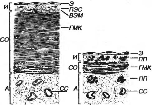 Рис. 1-3. Стенка артерии мышечного типа и сопровождающей ее вены. И - интима, СО - средняя оболочка, А - адвентиция. Э - эндотелий, ПЭС - подэндотелиальный слой, ВЭМ - внутренняя эластическая мембрана, ГМК - гладкомышечные клетки (циркулярный слой), ПП - продольные пучки гладкомышечных клеток в интиме и адвентиции вены, СС - сосуды сосудов.