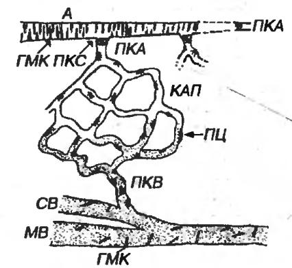 Рис. 1-4. Схема строения микроциркуляторного русла. А - артериола, ПКА – прекапиллярная артериола, ПКС - прекапиллярный сфинктер, КАП - капилляры, ПКВ - посткапиллярная венула, СВ - собирательная венула. MB - мышечная венула, ПЦ -перицит, ГМК - гладкомышечные клетки.