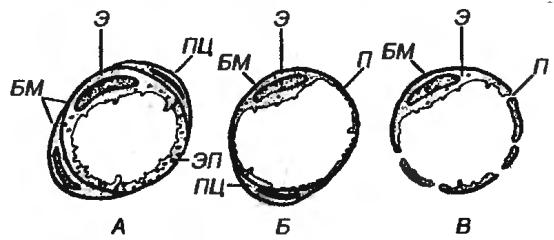 Рис. 1-5. Капилляры различных типов: А - с непрерывной эндотелиальной выстилкой, Б – фенестрированные, В – синусоидные. Э - эндотелиальная клетка, ПЦ - перицит, БМ - базальная мембрана, ЭП - эндоцитоэные пузырьки, П - поры в цитоплазме эндотелиоцитов