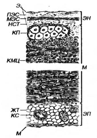 Рис. 1-6. Стенка сердца. ЭН - эндокард, М - миокард, ЭП - эпикард. Э – эндотелий, ПЭС - подэндотелиальный слой, МЭС - мышечно-эластический слой, НСТ - наружный соединительнотканный слой, КП - клетки Пуркииье, КМЦ - кардиомиоциты, ЖТ - жировая ткань, КС - кровеносные сосуды, М - мезотелий.
