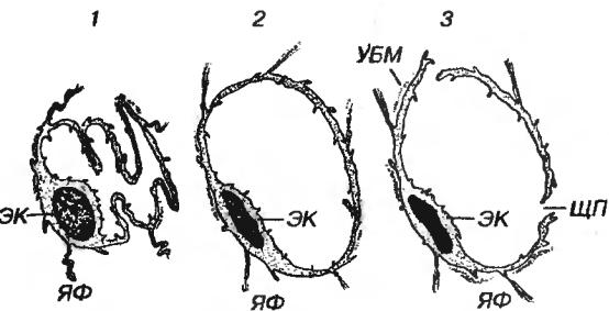 Рис. 1-7. Лимфатические капилляры в различном функциональном состоянии: 1 - спавшийся, 2 - заполненный лимфой, 3 - с расширенными межклеточными щелевидными пространствами. ЭК - эндотелиальные клетки, ЯФ - якорные филаменты, ЩП - щелевидные пространства, УБМ - участки базальной мембраны