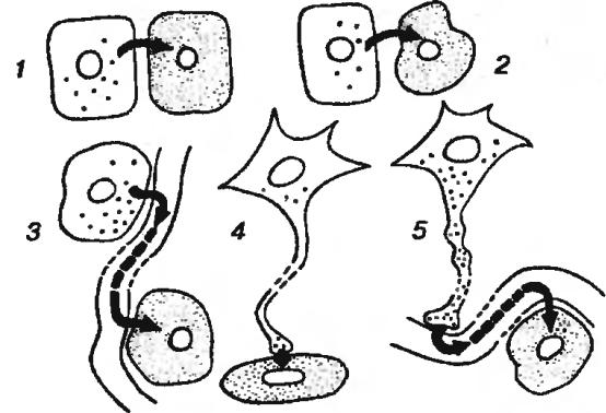 Рис. 3-1. Важнейшие виды регуляторных воздействий в организме. 1 - аутокринное, 2 - паракрииное, 3 – эндокринное, 4 - нервное, 5 - нейроэндокринное.
