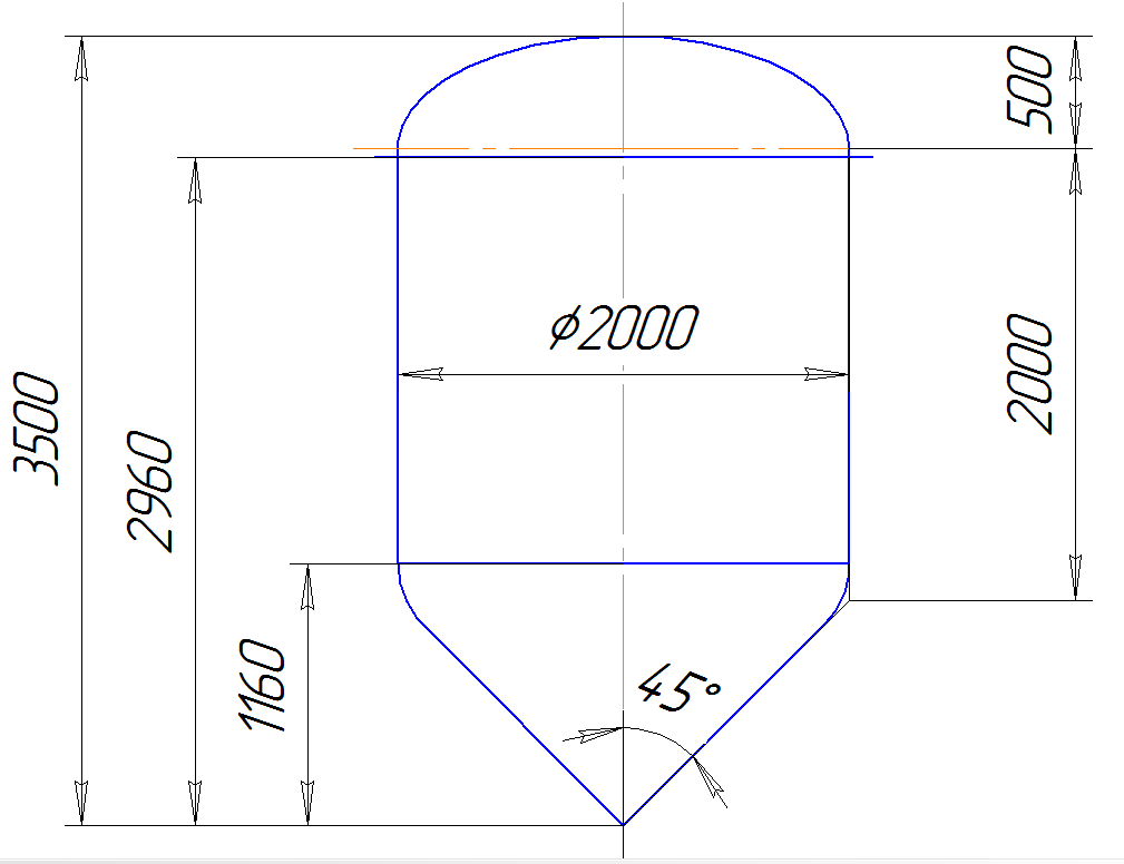 Далее рисуем контур аппарата, состоящий из контура эллиптической крышки, цилиндрической обечайки, конического днища и фланца на верхней крышке.