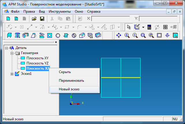 Построение корпуса аппарата начинаем с построения в нужной плоскости оси симметрии корпуса аппарата – ось аппарата проходит вертикально, поэтому строим ее в плоскости XZ, создав новый эскиз.