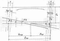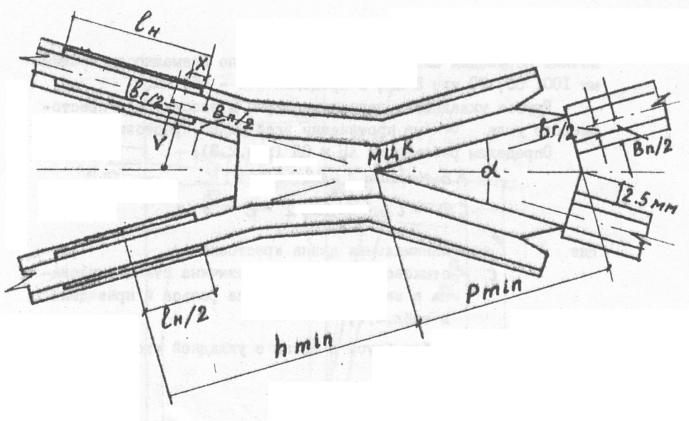 Расчет крестовины сводится к определению расстояния от начала усовиков до математического центра крестовины h и от математического центра крестовины до стыка сердечника с примыкающим рельсом P (рис. 2.1).