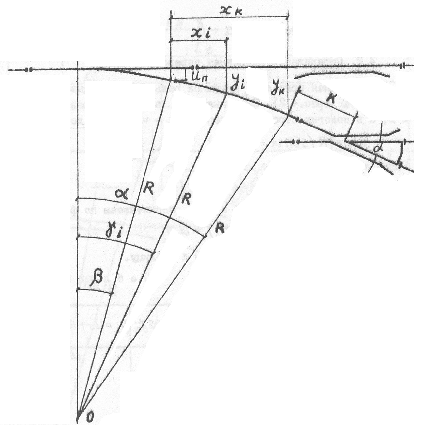 Переводная кривая по наружной рельсовой нити укладывается по координатам (рис. 2.7). Значениями х задаемся через каждые 2 м, а в пологих стрелочных переводах - через 4 м до значения
