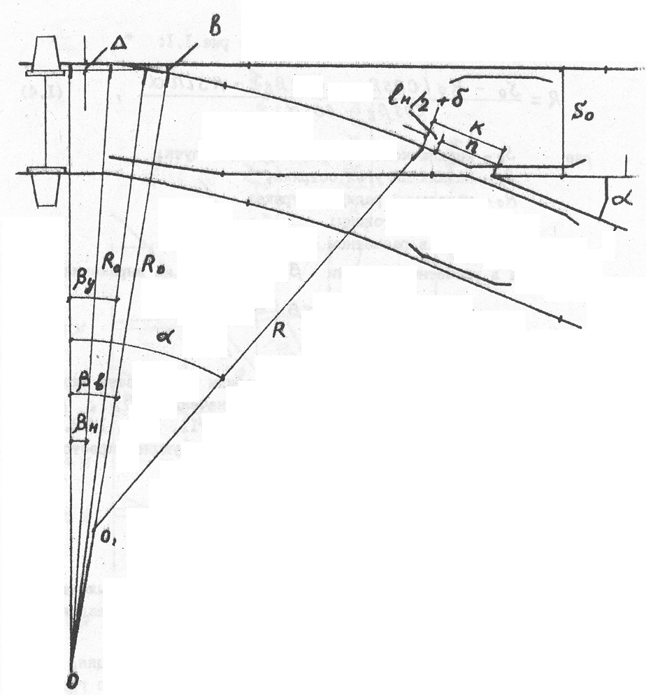 Величину проекции криволинейного остряка l'0 находим путем проектирования радиусов R0 и R на направление рабочей грани рамного рельса: