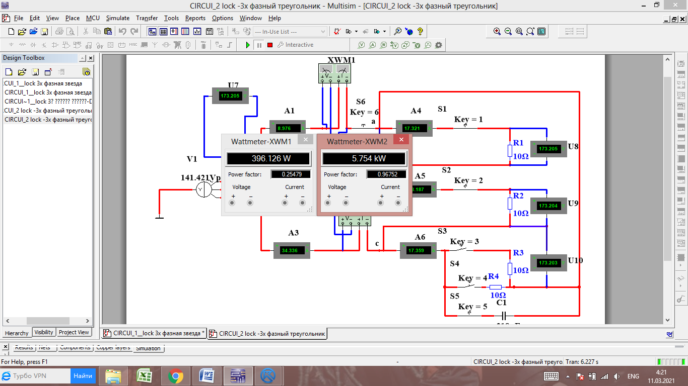 Задание: заполнить Таблица 1 для первого эксперимента. По результатам измерений построить ВД. Зарегистрировать показания P1, P2, P3 и коэффициентов мощности «Power Factor» и рассчитать активную мощность и реактивную мощность.
