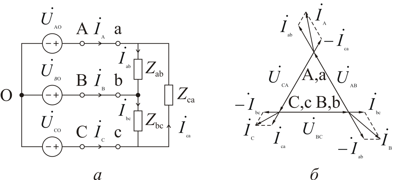 На Рисунок 2, а изображена схема трехфазной цепи, у которой приемник соединен треугольником.