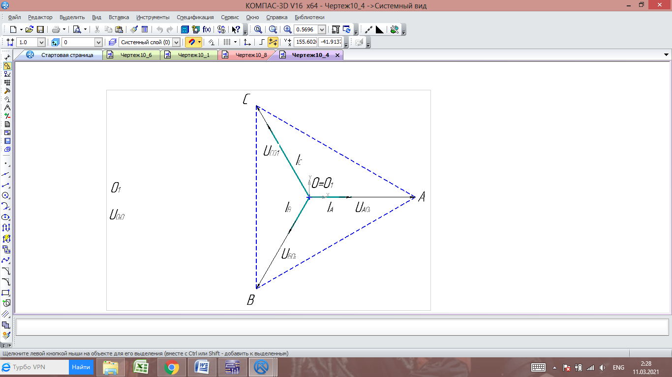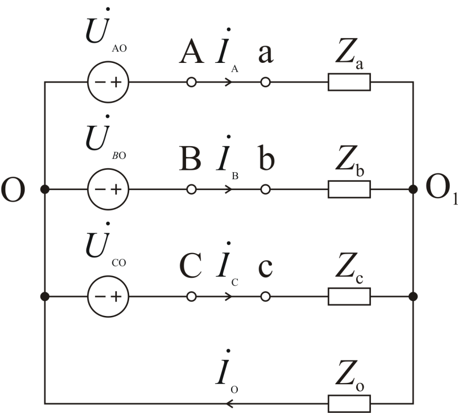 На Рисунок 1 изображена четырехпроводная трехфазная цепь, у которой источник и приемник соединены звездой с нейтральным (нулевым) проводом.