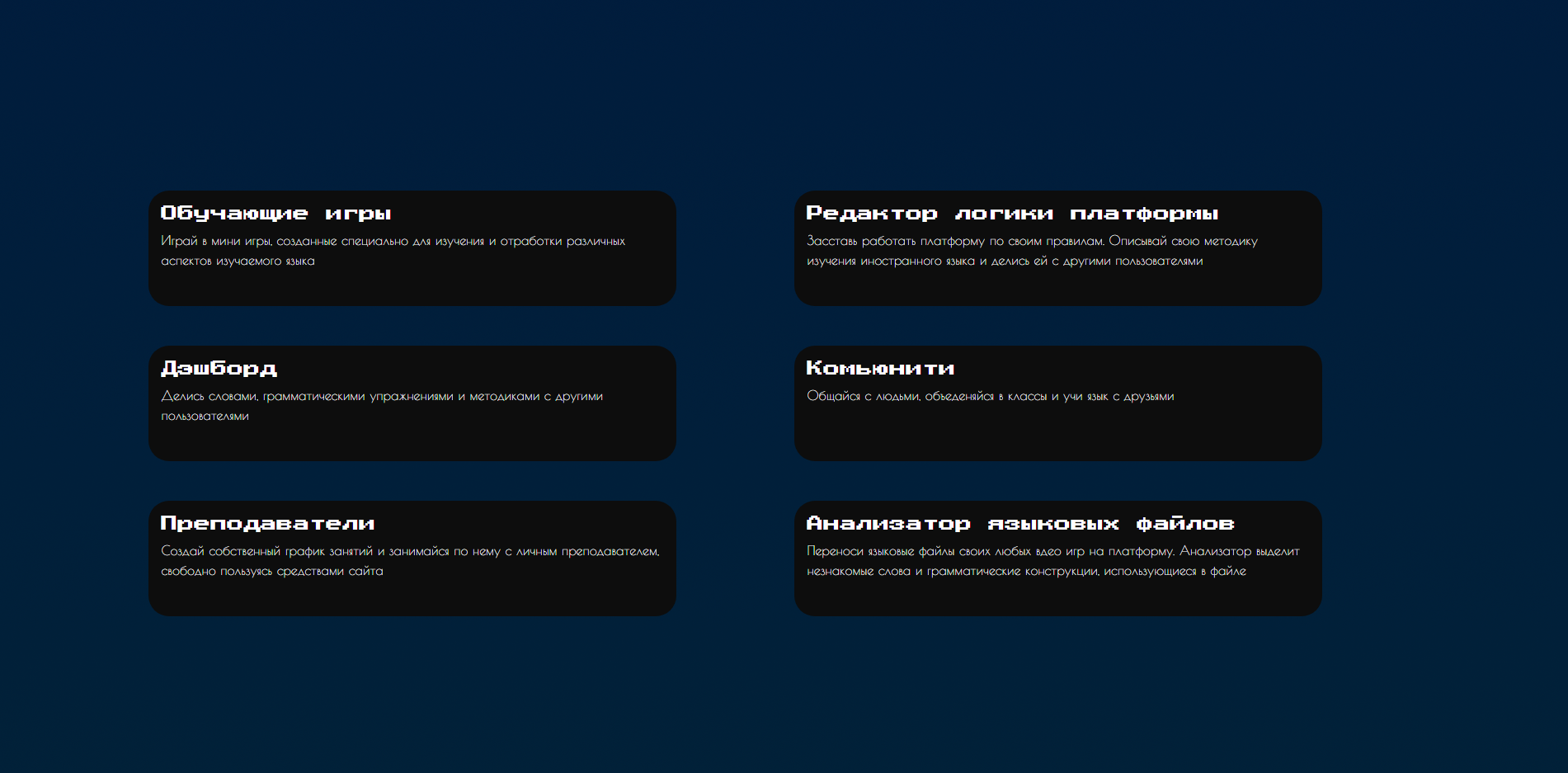 В рамках сайта создана лендинговая страница, выполняющая роль страниц информации о сайте, регистрации и входа на основную страницу платформы.