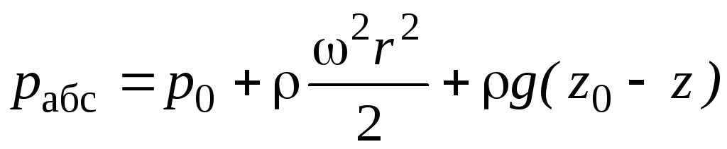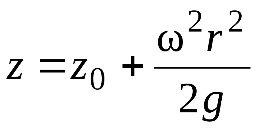 При относительном покое жидкости в равномерно вращающемся сосуде вокруг вертикальной оси свободная поверхность имеет форму параболоида вращения. Уравнение свободной поверхности имеет вид