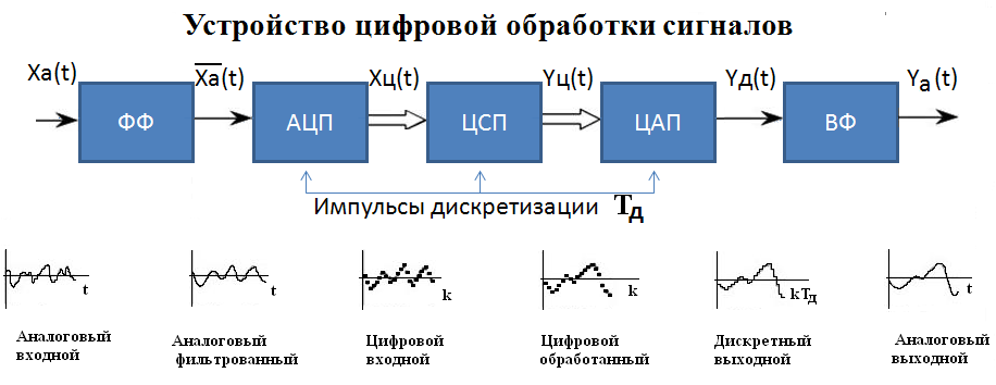24. Структурная схема цифровой обработки сигналов.назначение СВХ и АЦП. Характер сигналов на выходе элементов структурной схемы.