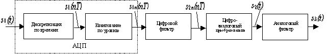 При использовании цифровой обработки аналоговый сигнал должен быть сначала преобразован в цифровой с помощью таких операций, как дискретизация по времени и дискретизация по уровню (квантование). После обработки с помощью цифровых фильтров, цифровой сигнал преобразуется снова в аналоговый. Таким образом, структурную схему цифровой обработки аналогового сигнала можно представить в следующем виде (рис.1):