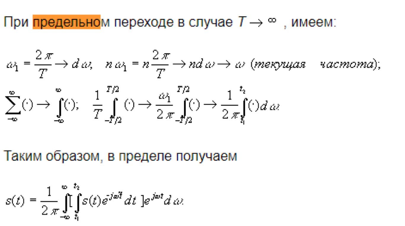 Таким образом, для описания спектра финитного сигнала приходим к известному в математике интегральному преобразованию Фурье: