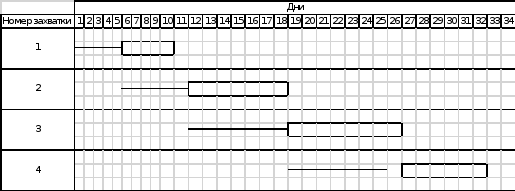 Вывод: путем только организационных решений удалось сократить общий срок строительства Тобщ до 32 дней, но появились дни простоя у монтажников Q = 1 день.