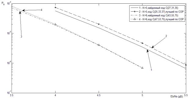 Видно, что найденный сверточный код C(27,31,35) имеет выигрыш около 0,15 дБ по сравнению с известным кодом C(25,33,37).