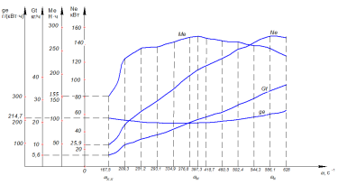 Для остальных значений ωx расчеты выполнялись аналогично, результаты расчетов сведены в таблицу 3.1. Кроме того, по полученным данным построена внешняя скоростная характеристика проектируемого 4-х цилиндрового бензинового двигателя (рисунок 3.2).